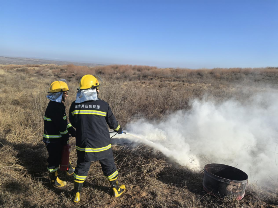 演練模擬二號風井廠西北側草木區域突發火情,現場煙霧迅速彌漫。值班人員發現險情后,第一時間向公司調度指揮中心報告并撥打火警電話;調度員接報后迅速響應,按程序逐級上報,立即啟動應急救援預案;應急指揮部隨即成立,各應急救援小組迅速集結到位。