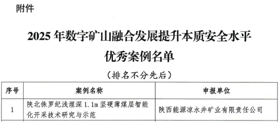 近日,2025年數(shù)字礦山融合發(fā)展提升本質(zhì)安全水平典型案例名單正式公布,涼水井礦業(yè)《陜北侏羅紀淺埋深1.1m 堅硬薄煤層智能化開采技術研究與示范》項目成功入選。