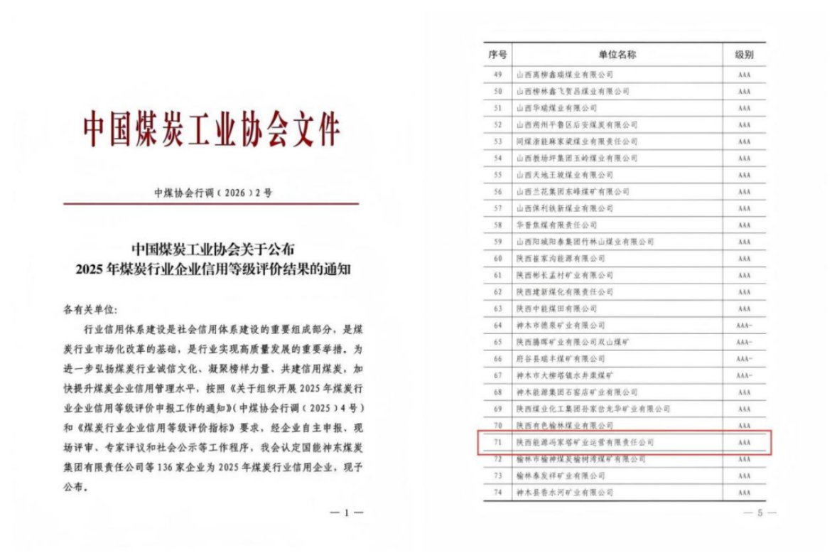 近日,中國煤炭工業協會公布2025年煤炭行業企業信用等級評價結果,馮家塔運營憑借規范經營、堅實合規根基與突出社會責任,順利通過嚴格評審,榮獲3A級信用企業稱號。煤炭行業企業3A級信用等級是中國煤炭工業協會評定的行業最高信用等級,綜合考量企業經營、管理、合規、履約等多維度表現,是衡量企業市場公信力的重要標桿,此次獲評標志著馮家塔運營合規誠信經營躋身行業先進行列。