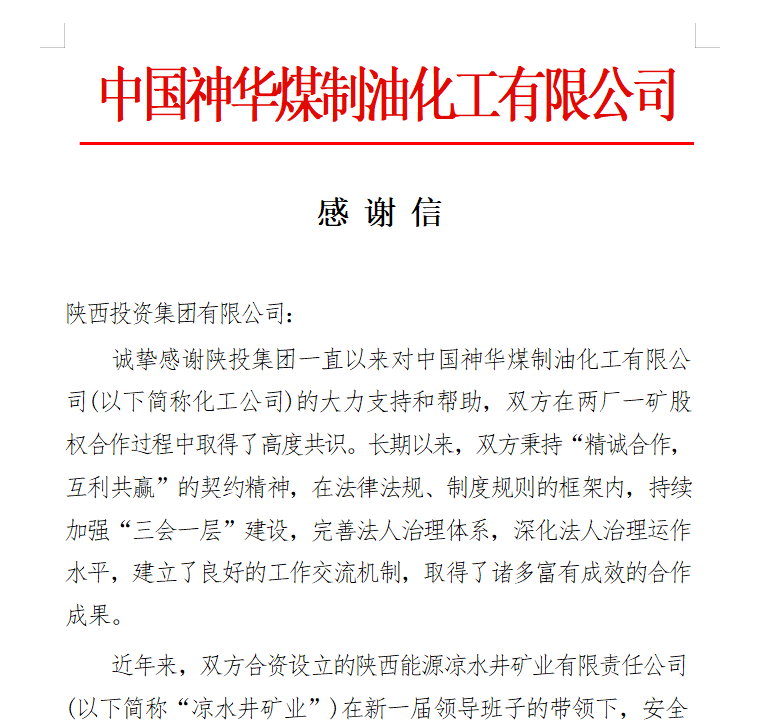 “誠摯感謝陜投集團一直以來對中國神華煤制油化工有限公司的大力支持和幫助……作為股東方,我們對涼水井礦業領導班子和廣大干部職工所做的突出貢獻予以充分肯定和高度贊賞,并向大家表示衷心的感謝!”近日,中國神華煤制油化工有限公司向集團公司發來感謝信,對與集團在兩廠一礦股方面的良好合作,對陜西能源權屬涼水井礦業公司生產經營的突出成果表達誠摯感謝。