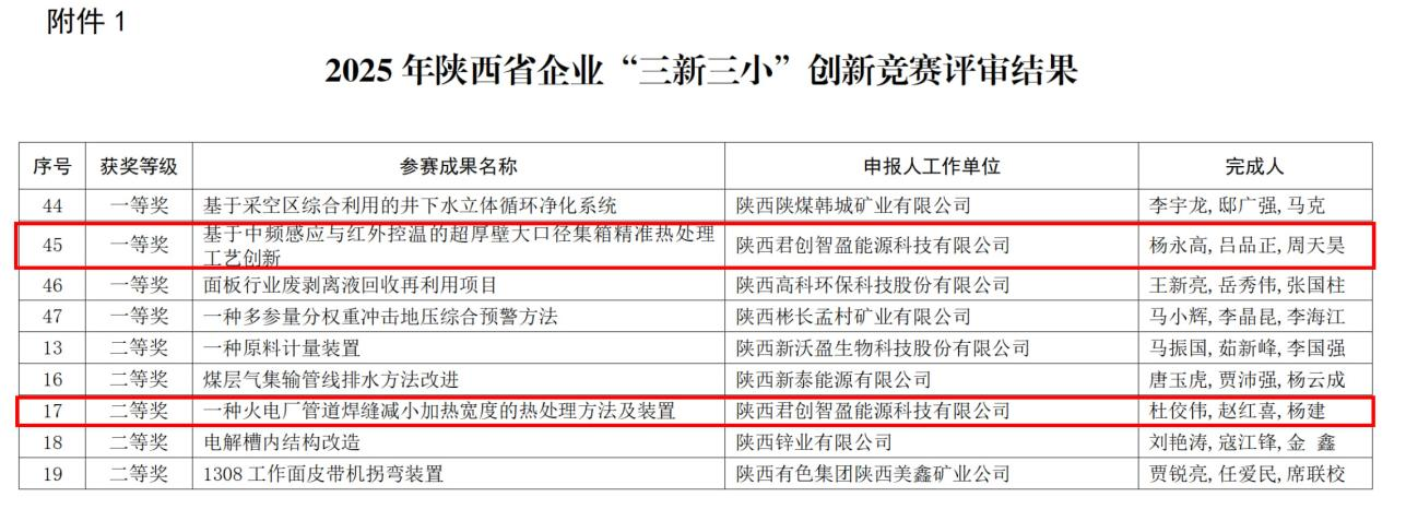 7月20日,電力運(yùn)營(yíng)獲悉在2025年陜西省企業(yè)“三新三小”創(chuàng)新競(jìng)賽中,公司下屬子公司君創(chuàng)科技《基于中頻感應(yīng)與紅外控溫的超厚壁大口徑集箱精準(zhǔn)熱處理工藝創(chuàng)新》斬獲一等獎(jiǎng),《一種火電廠管道焊縫減小加熱寬度的熱處理方法及裝置》獲二等獎(jiǎng)。